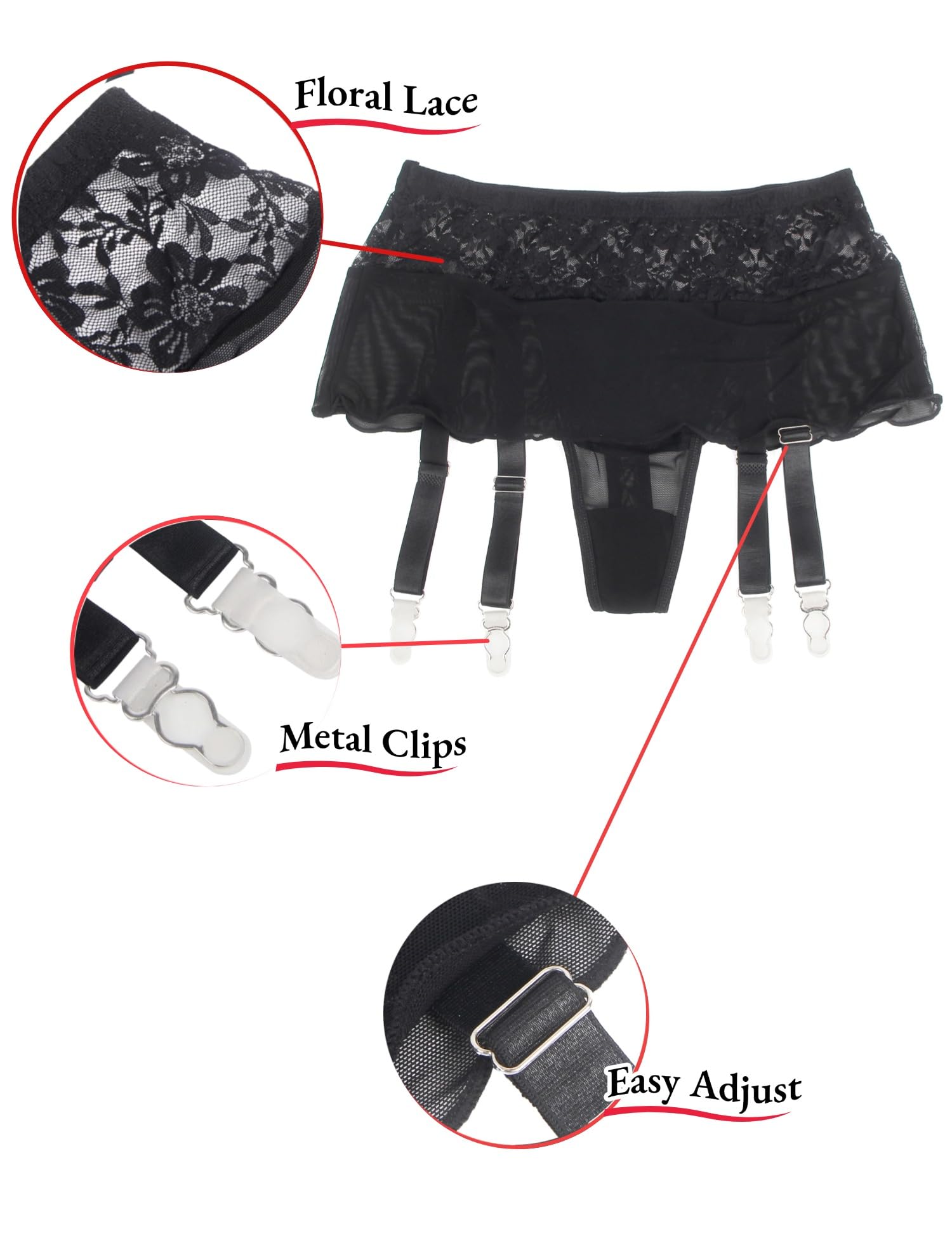 ohyeah Black Lace Thong Garter Belt 4 Metal Clips Garter Belts Suspender for Thigh Highs Stockings Fits S-XXL (No Socks)